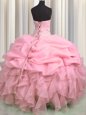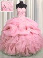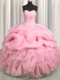 Home >  Quinceanera Dresses >  New Arrival Quinceanera Dresses > Visible Boning Sleeveless Organza Floor Length Lace Up Sweet 16 Dress in Rose Pink for with Beading and Ruffles and Pick Ups