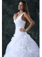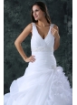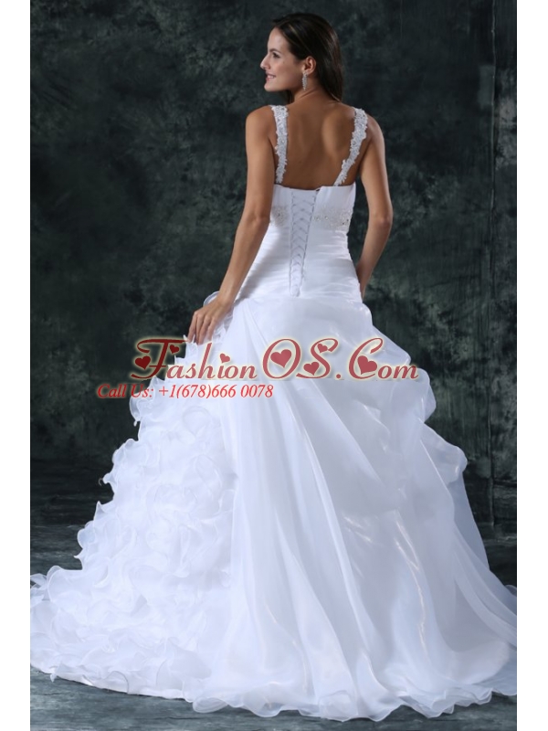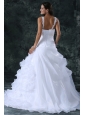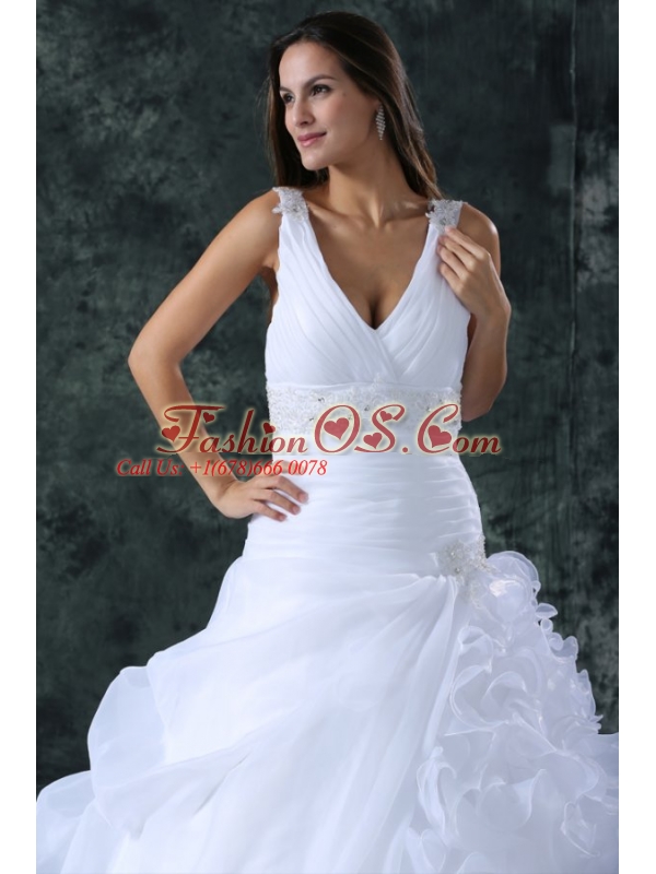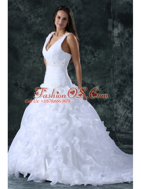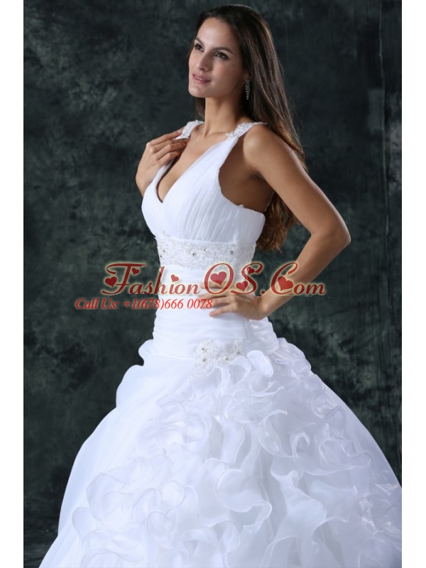 V-neck Appliques and Ruffles Sweep Train Organza Wedding Dress