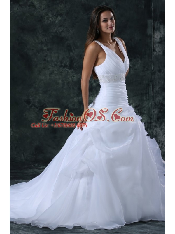 Home >  Wedding Dresses >  Perfect Wedding Dresses > V-neck Appliques and Ruffles Sweep Train Organza Wedding Dress