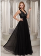If you're looking for a chic and elegant design for your next event, look no further. This black prom dress will definitely suffice. It features two straps forming a gorgeous V neck for the front and open back on the shinning beaded bodice, which can show off your sexy and wild. The waistband accents the slim waist. The skirt is overlayed with airy chiffon fabric pooling to the floor, creating a lovely silhouette. Just a very flattering design for any body shape or style.