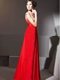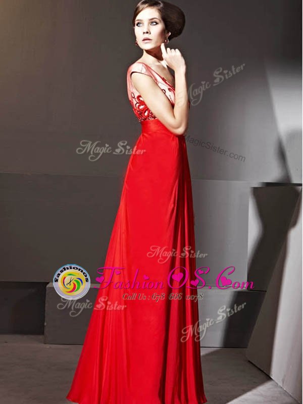 Home >  Prom Dresses >  Perfect Prom Dresses > V-neck Cap Sleeves Homecoming Dress Floor Length Beading and Appliques and Ruching Red Chiffon