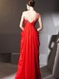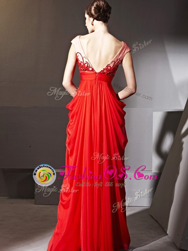 V-neck Cap Sleeves Homecoming Dress Floor Length Beading and Appliques and Ruching Red Chiffon
