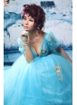 V-neck Floor-length Aqua Blue Appliques Prom Gowns With Floor-length Romantic Customize