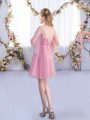 V-neck Half Sleeves Bridesmaid Dress Mini Length Appliques and Belt Pink Tulle