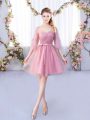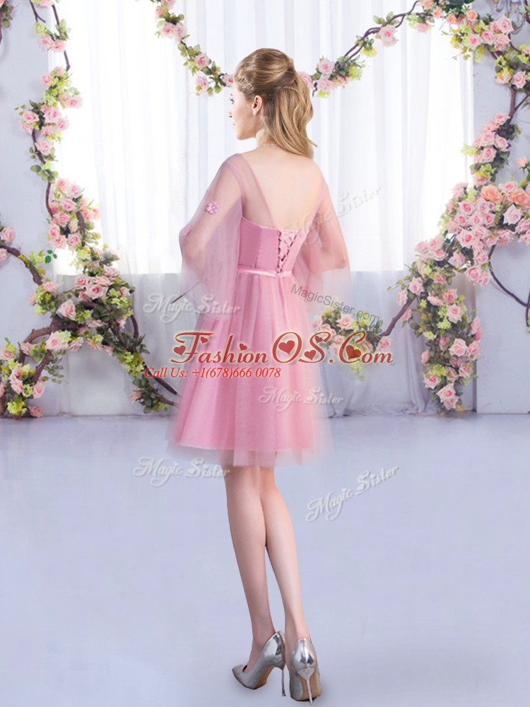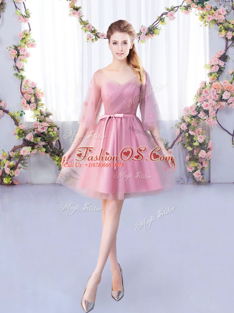 Home >  Bridesmaid Dresses >  Perfect Bridesmaid Dresses > V-neck Half Sleeves Bridesmaid Dress Mini Length Appliques and Belt Pink Tulle