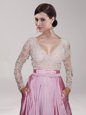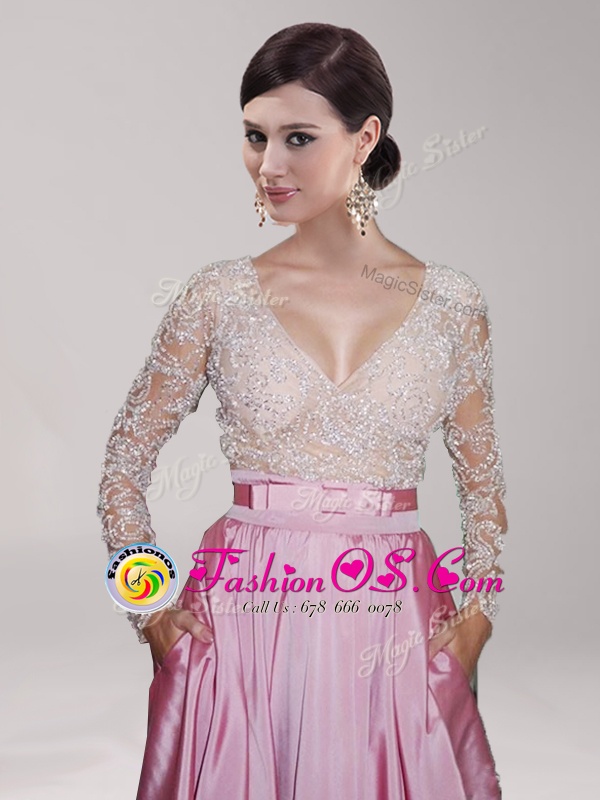 V-neck Long Sleeves Taffeta Prom Evening Gown Beading and Belt Zipper