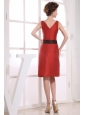 V-neck Neckline Wine Red Taffeta Black Sash Knee-length 2013 Prom Dress