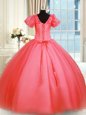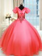 V-neck Short Sleeves Organza 15th Birthday Dress Appliques Lace Up
