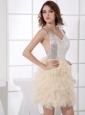 V-neck Silver and Champagne Sequin and Organza Mini-length Ruffles 2013 Prom Dress