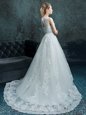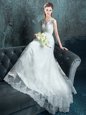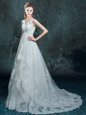 V-neck Sleeveless Bridal Gown With Brush Train Lace and Appliques White Tulle