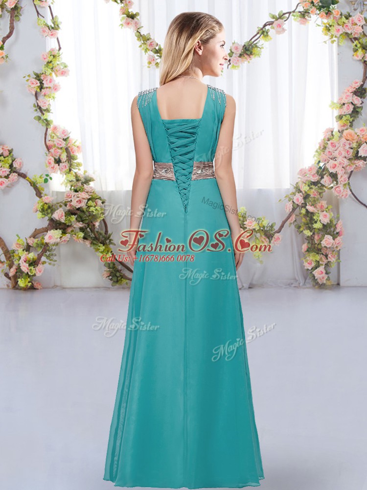 V-neck Sleeveless Quinceanera Court Dresses Floor Length Beading and Belt Blue Chiffon