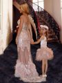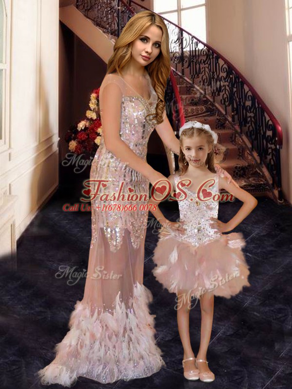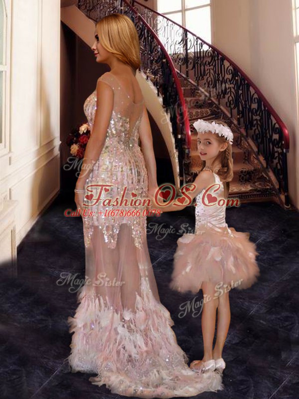 V-neck Sleeveless Tulle Prom Gown Beading and Ruffles and Sequins Brush Train Zipper
