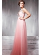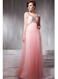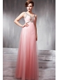 Stunning is one word that comes to mind when you look at this gorgeous pink gown. It features wide, beaded straps, an symmetrical embellished bodice with crystals covered around the bust but left a interspace in the middle part. The floor-length skirt extends from the pleat in the midsection in smooth, clean lines while enveloping your legs in beautiful tulle fabric. Such a beautiful gown for any dressy occasion.