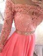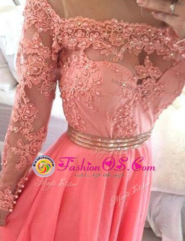 Watermelon Red A-line Scoop Long Sleeves Chiffon Floor Length Zipper Beading and Appliques Prom Party Dress