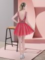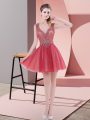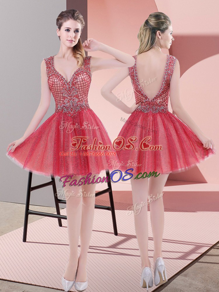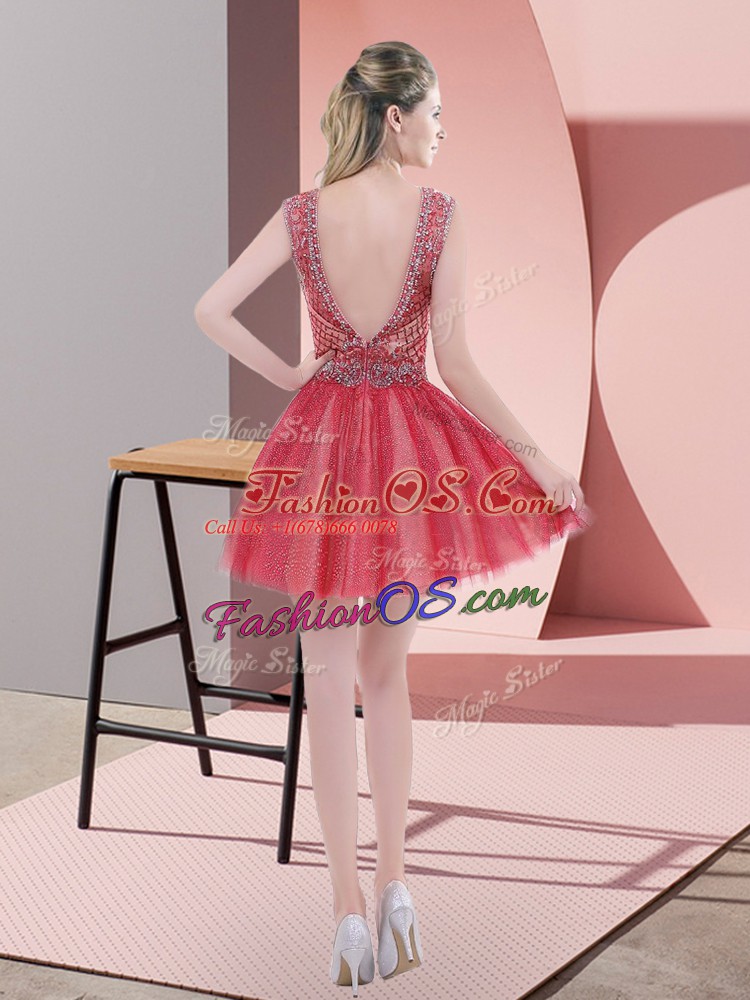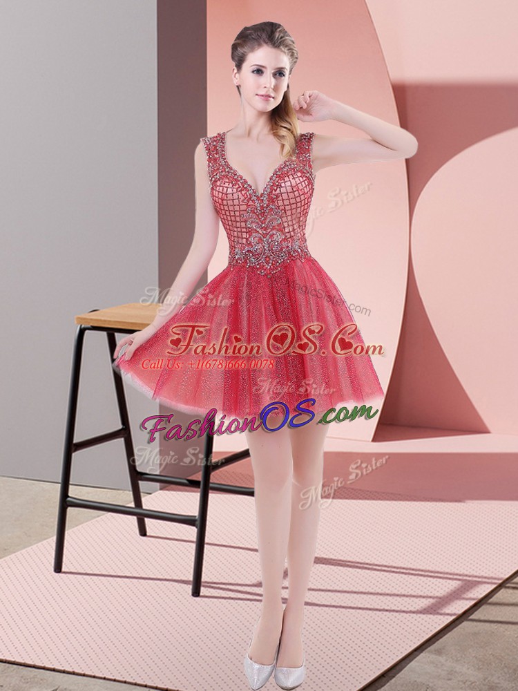 Watermelon Red A-line V-neck Sleeveless Tulle Mini Length Backless Beading Prom Dress