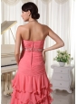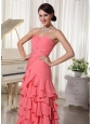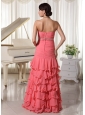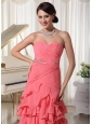 Watermelon Red Chiffon Layered Column Prom Dress With Sweetheart Ruched Up Bodice and Beading Decorate Waist