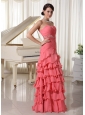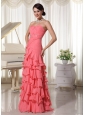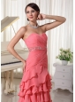 Home >  Prom Dresses >  New Arrivals > Watermelon Red Chiffon Layered Column Prom Dress With Sweetheart Ruched Up Bodice and Beading Decorate Waist