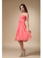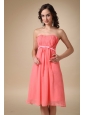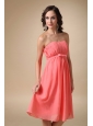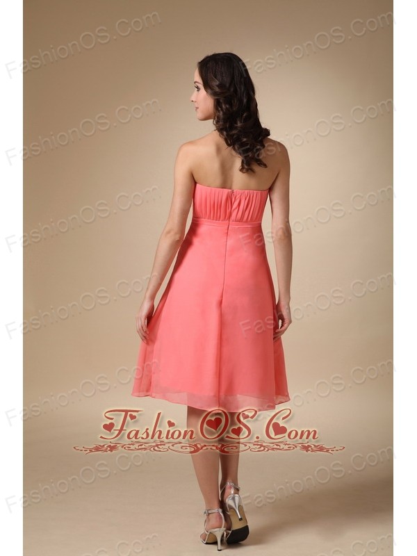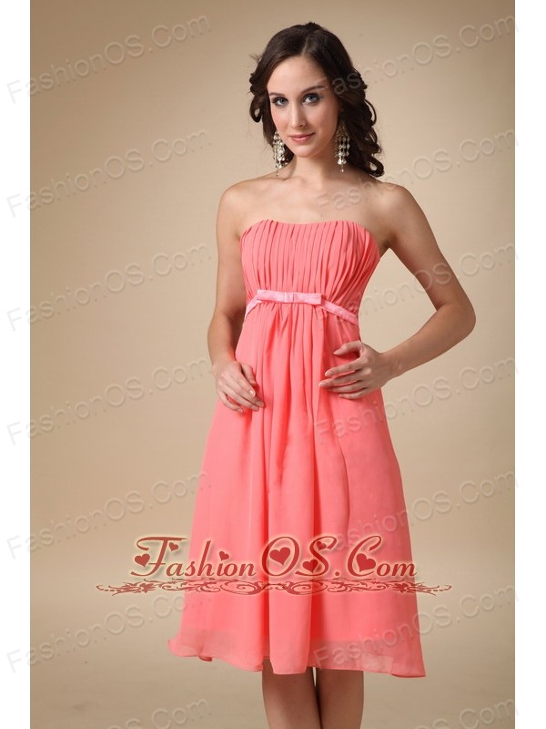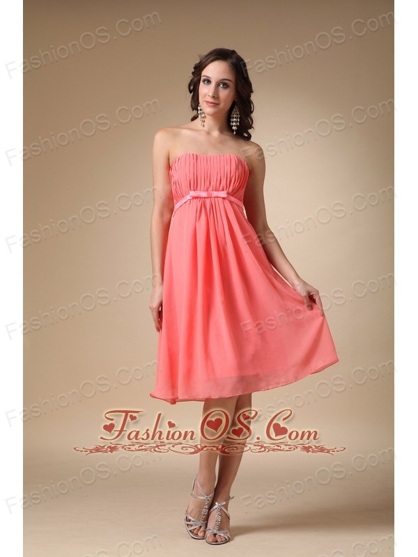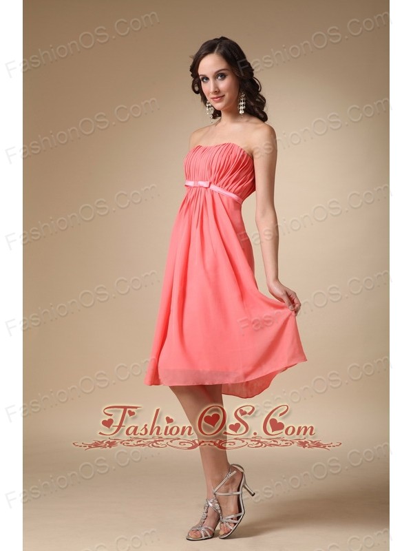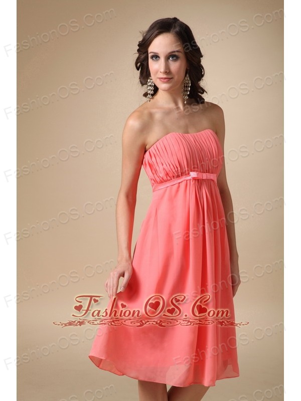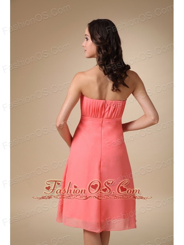 Home >  Bridesmaid Dresses >  Simple Bridesmaid Dresses > Watermelon Red Empire Strapless Knee-length Chiffon Ruch Bridesmaid Dress