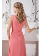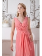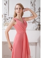 Watermelon Red Empire V-neck Ruch Bridesmaid Dress Chiffon Brush Train