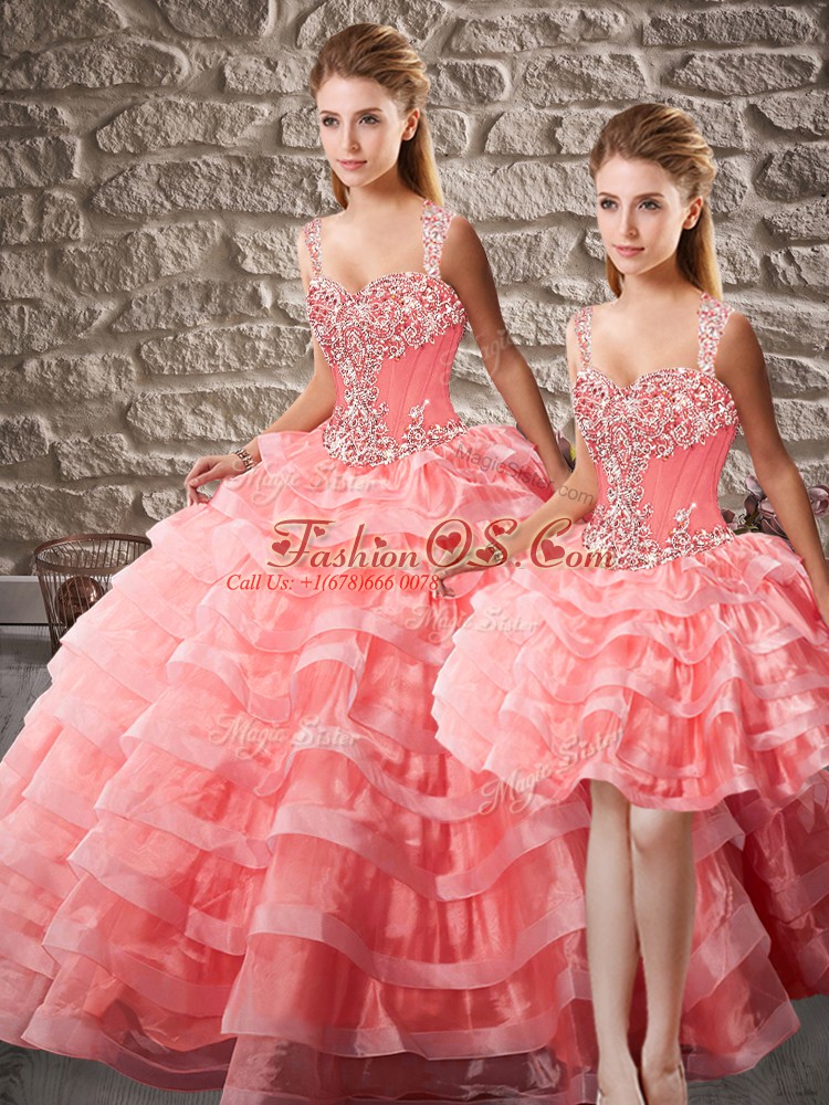Home >  Quinceanera Dresses >  Quinceanera Dresses 2019 > Watermelon Red Lace Up Straps Beading and Ruffled Layers Sweet 16 Quinceanera Dress Organza Sleeveless Court Train