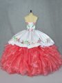 Watermelon Red Satin and Organza Lace Up Quinceanera Dresses Sleeveless Embroidery and Ruffles
