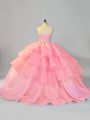 Watermelon Red Sleeveless Organza Brush Train Lace Up Quince Ball Gowns for Sweet 16 and Quinceanera