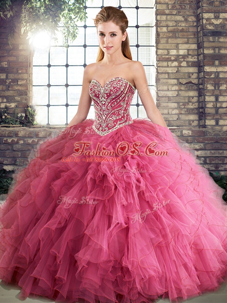Watermelon Red Sweetheart Lace Up Beading and Ruffles Sweet 16 Dresses Sleeveless