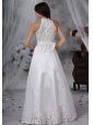 This wonderful wedding dress is accented with a halter top specialized by lace fabric to cover the chest and the A-line skirt starting from hugging-body waist with beautiful lace trim, which adds your elegance and upgrades your taste. The bows in the front and back adds another dimension beauty to this already lovely gown. A hidden zipper makes for easy off and on and secures the dress in place.