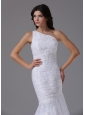 Size your day in this exclusive one shoulder wedding dress. It features a fitted bodice with flattering ruches all throughout the body part and the ruches creates a cross over look. The one shoulder strap divides into three spaghetti straps, achieving a special look. The fasteners decorate on the back are the lighspot. The mermaid train adorned by pleated white lace make this dress graceful! This dress is your wise choice for your wedding!