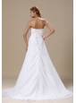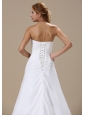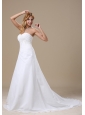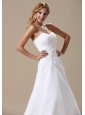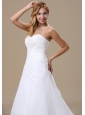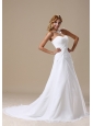 Simple yet elegant! This white wedding gown features a sweetheart neckline with ruching and beautiful appliques.the floor length A-line skirt flows beautifully with a loose fit. It pools beautifully at your feet before extending into a sweeping train in the back. A lace up corset style closure in the back secures the dress in place.