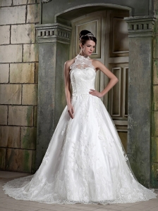 Elegant A-Line / Princess Square Neck Chapel Train Organza Appliques Wedding Dress