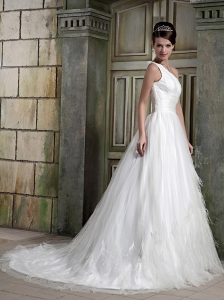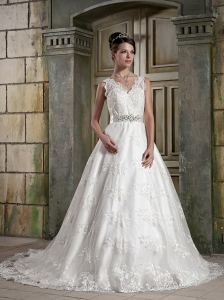 V-neck Watteau Train and Beaded Decorate Waist For 2013 Wedding Dress