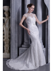 Fashionable Mermaid High-neck Brush Lace and Satin Beading Wedding Dress