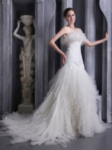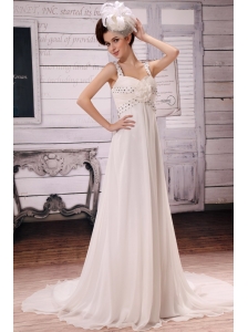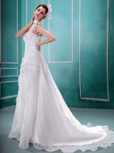 One Shoulder A-line Hand Made Flowers Court Train Church Custom Made Wedding Dress