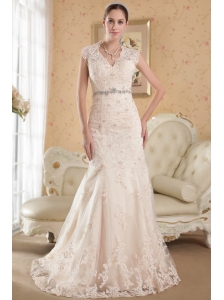 Champagne Mermaid V-neck Court Train Lace Beading Wedding Dress
