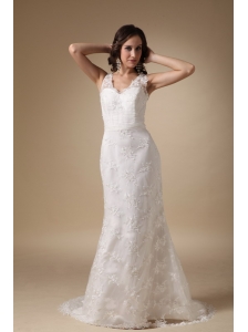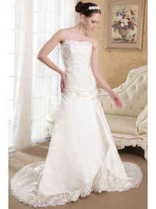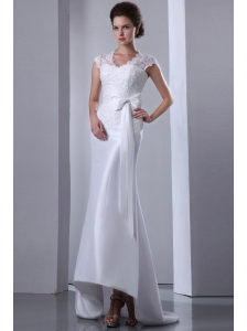 Cheap Column V-neck Brush Train Taffeta and Lace Wedding Dress