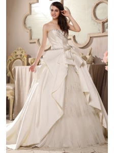 A-line Sweetheart Beading Bow Ruching Chapel Train Wedding Dress