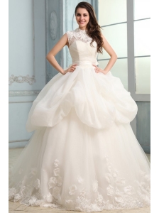 A-Line High Neck Organza Wedding Dress with Chapel Train with Appliques