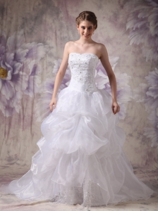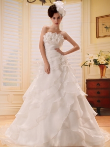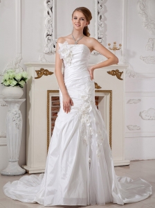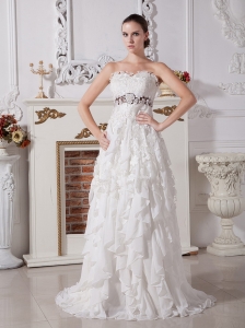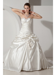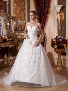 White Ball Gown Sweetheart Wedding Dress Hand Made Flowers Brush Train Organza