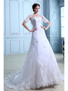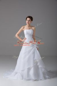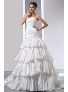 Beautiful A-line Strapless Low Cost Wedding Dress Court Train Lace Hand Made Flowers
