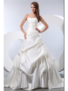 Simple A-line Strapless Low Cost Wedding Dress Chapel Train Satin and Taffeta Pick-ups