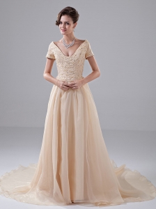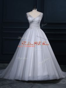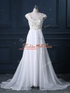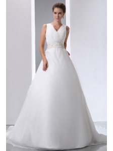 Beading A-Line V-neck Court Train Organza Church Wedding Dress