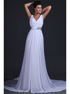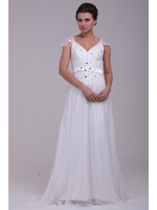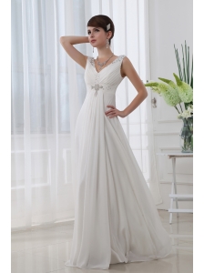 Discount Empire V-neck Floor-length Chiffon White Wedding Dress with Beading