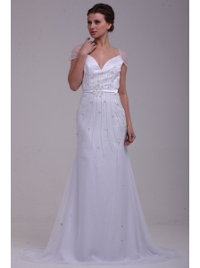 Column V-Neck Beading Brush Train Chiffon Wedding Dress