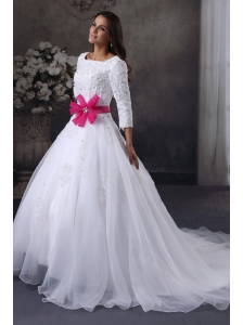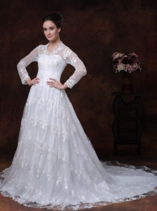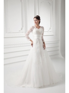 A-line V-neck Long Sleeves Lace Belt Court Train Wedding Dress