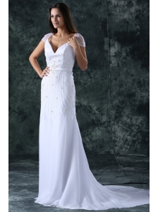 Column V-Neck Cap Sleeves Brush Train Zipper Up Chiffon Wedding Dress