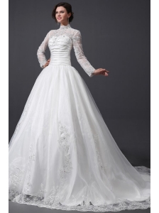 A-Line High Neck Organza Wedding Dress with Chapel Train with Appliques