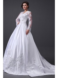 A-line V-neck Long Sleeves Satin Chapel Train Wedding Dress