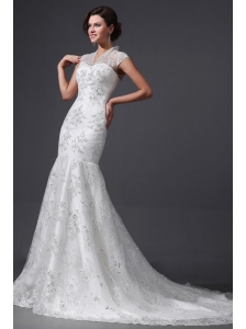 Column High Neck Appliques Lace Wedding Dress with Court Train