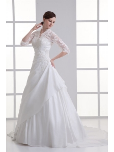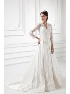 A-Line V-Neck Lace Up Lace Appliques Court Train Wedding Dress with 3/4 Sleeveles